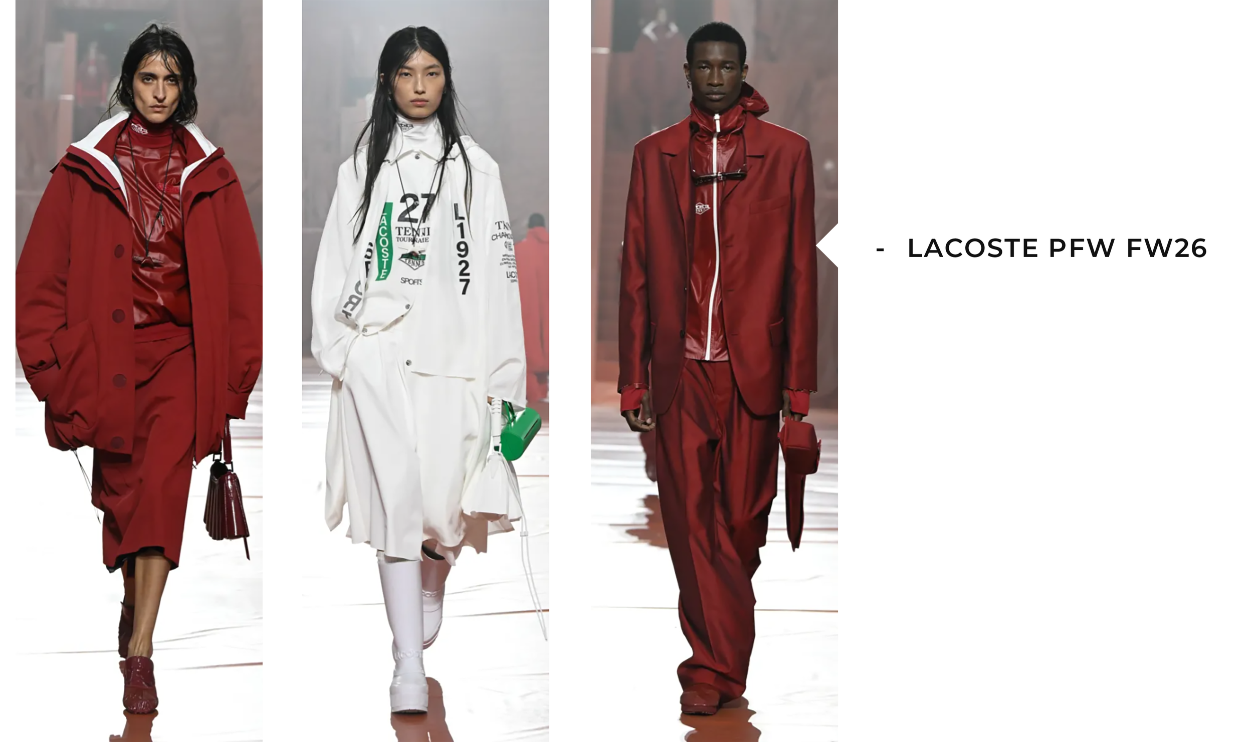 I do love seeing all the shows that take place through Fashion Month! NYFW FW26 was a time for sure and today at Paris Fashion Week, Lacoste showcased their FW26 collection on the runway. For those that may not be aware, I worked at Lacoste at their HQ here in NY from 2007 - 2010 as the Assistant to the Sr VP in the Wholesale department and I always love seeing the innovations that take place with this brand which is known for their signature premium sportswear for men and women with great accessories to continue their active lifestyle element to their collection! These are some of my favorite looks and with Creative Direction led by Pelagia Kolotouros, it was eye catching within their rain theme!